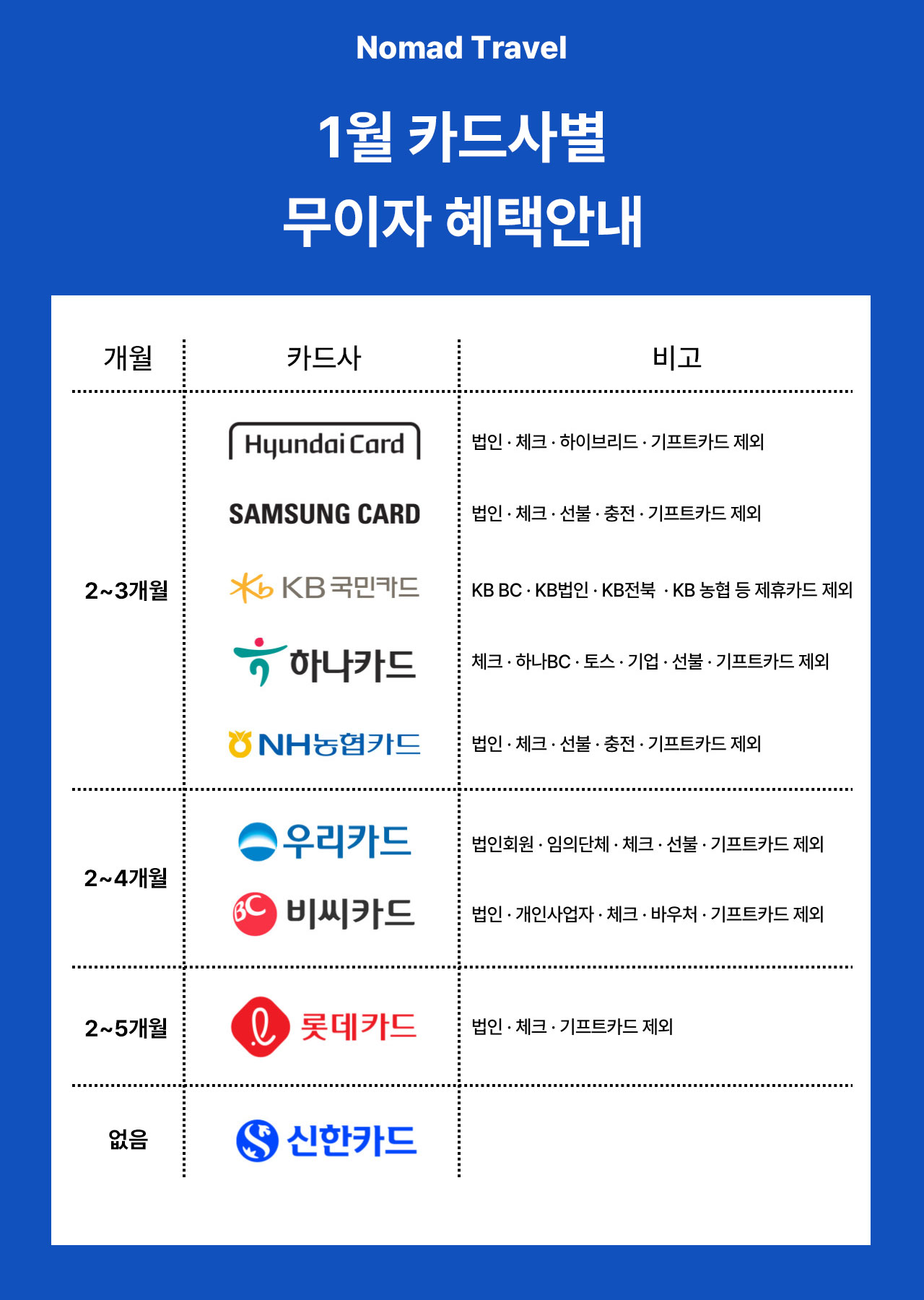 ※적용기간 : 1.1 - 1.31 안녕하세요. 노마드트래블입니다 :)2026년 1월 카드사별 무이자 혜택 안내드립니다. ※ 본 할부 무이자는 매달 적용 내용이 변경 됩니다. ※ 본 할부 ...
