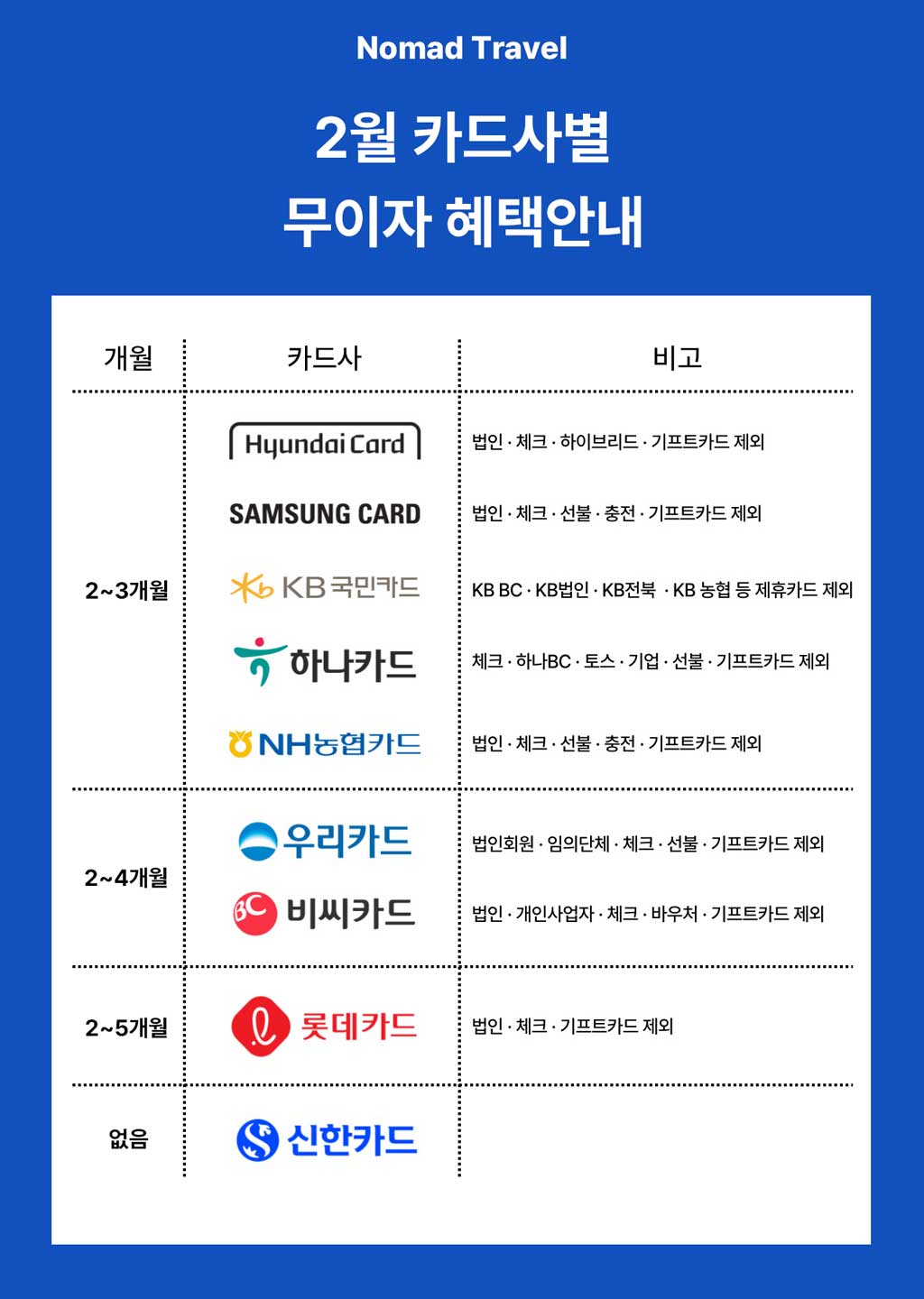 ※적용기간 : 2.1 - 2.28 안녕하세요. 노마드트래블입니다 :)2026년 2월 카드사별 무이자 혜택 안내드립니다. ※ 본 할부 무이자는 매달 적용 내용이 변경 됩니다. ※ 본 할부 ...