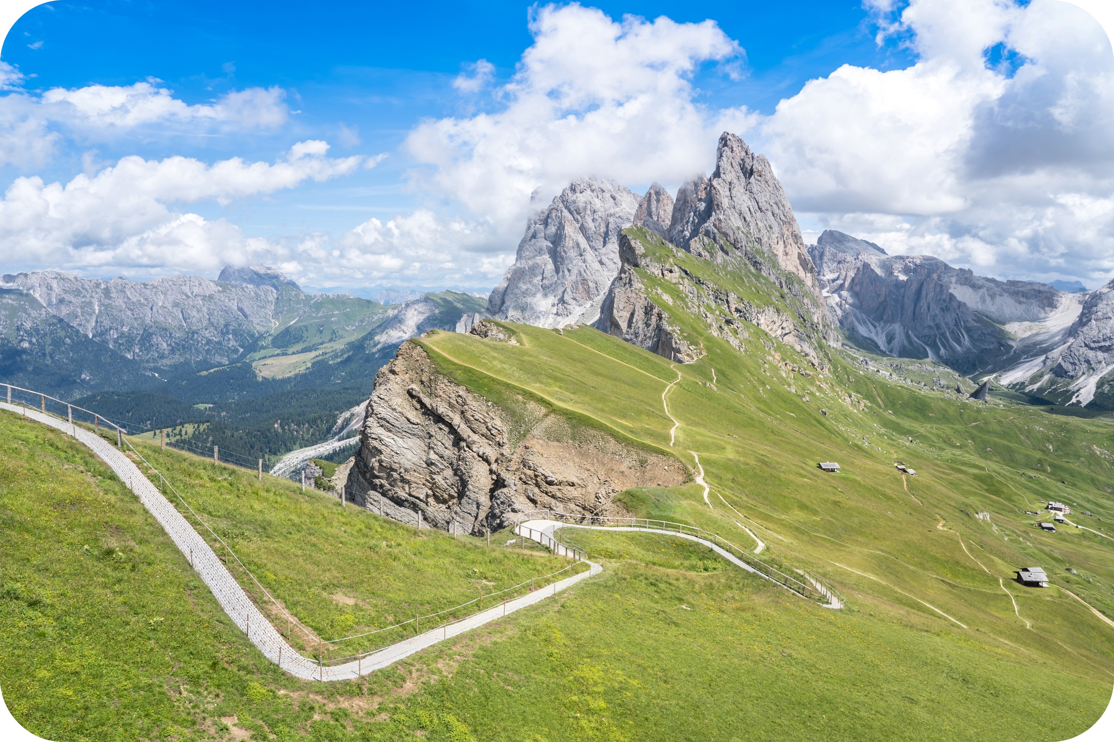 세체다는 칼날처럼 이어진 능선과 수직에 가까운 절벽이 만들어내는 파노라마 풍경으로 돌로미티를 대표하는 전망대입니다. 비교적 짧은 이동만으로도 사소룽고 산군을 한눈에 조망할 수 있어, 짧지만 강렬한 인상을 남깁니다. 세체다는 돌로미티의 거대한 산세를 가장 직관적으로 마주할 수 있는 장소 중 하나입니다.