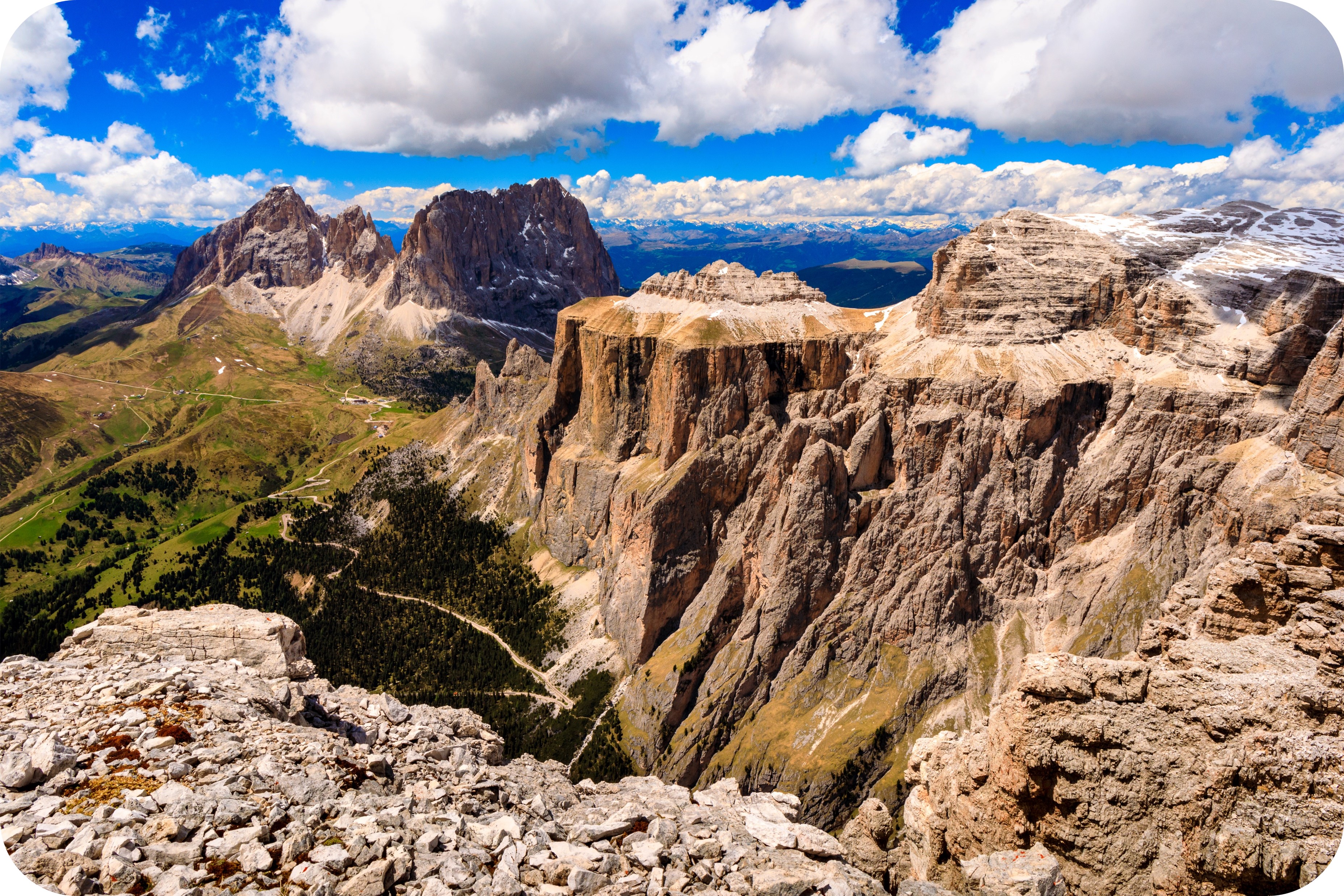 싸소 포르도이는 해발 약 2,950m에 위치한 전망대로, ‘돌로미티의 테라스’라는 별명으로 잘 알려져 있습니다. 케이블카를 통해 비교적 수월하게 접근할 수 있으며, 정상에 서면 마르몰라다를 비롯한 돌로미티 주요 산군이 360도로 펼쳐집니다. 하늘과 가장 가까운 곳에서 돌로미티의 스케일을 한눈에 조망할 수 있는 상징적인 장소입니다.