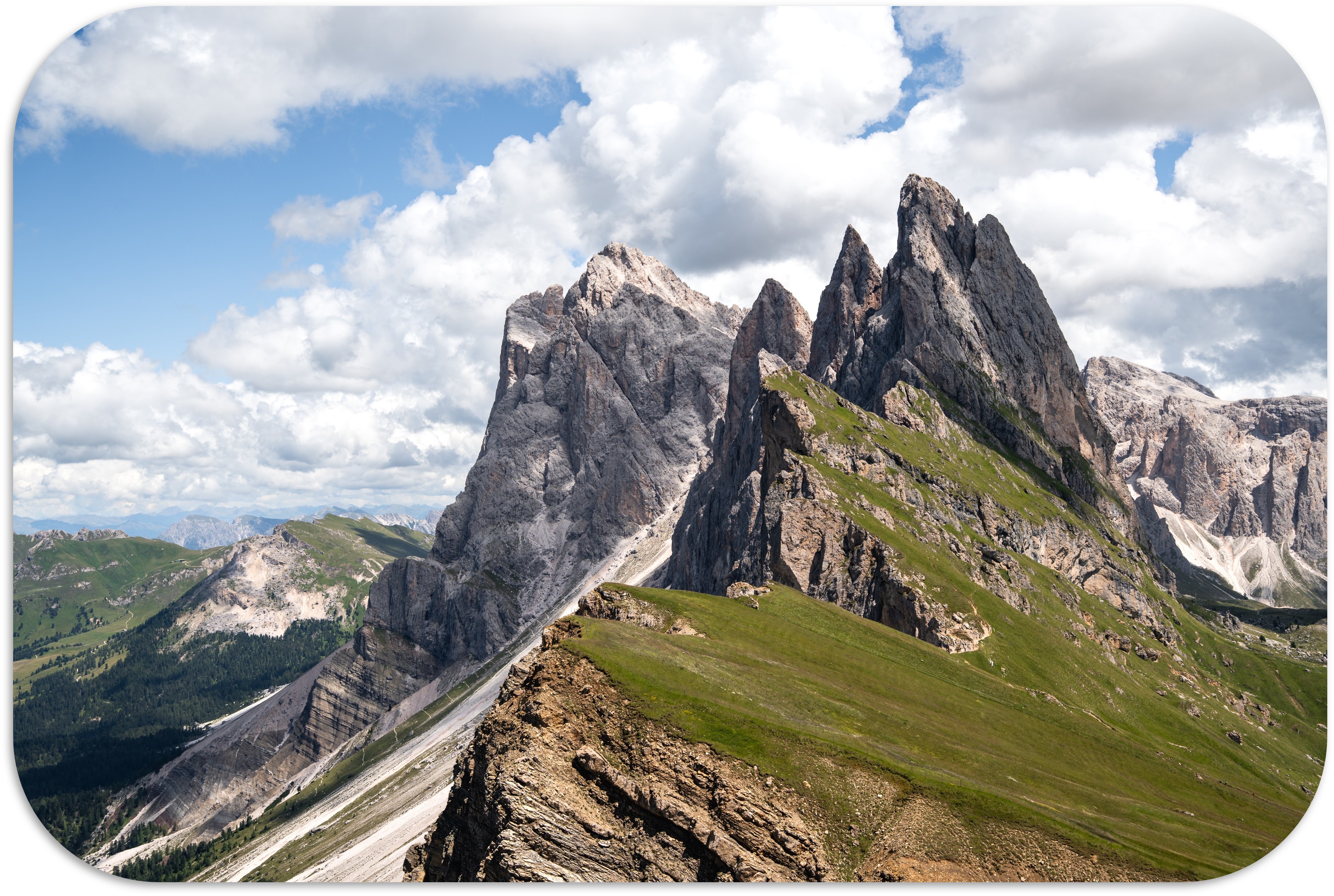 세체다는 칼날처럼 이어진 능선과 수직에 가까운 절벽이 만들어내는 파노라마 풍경으로 돌로미티를 대표하는 전망대입니다. 비교적 짧은 이동만으로도 사소룽고 산군을 한눈에 조망할 수 있어, 짧지만 강렬한 인상을 남깁니다. 세체다는 돌로미티의 거대한 산세를 가장 직관적으로 마주할 수 있는 장소 중 하나입니다.