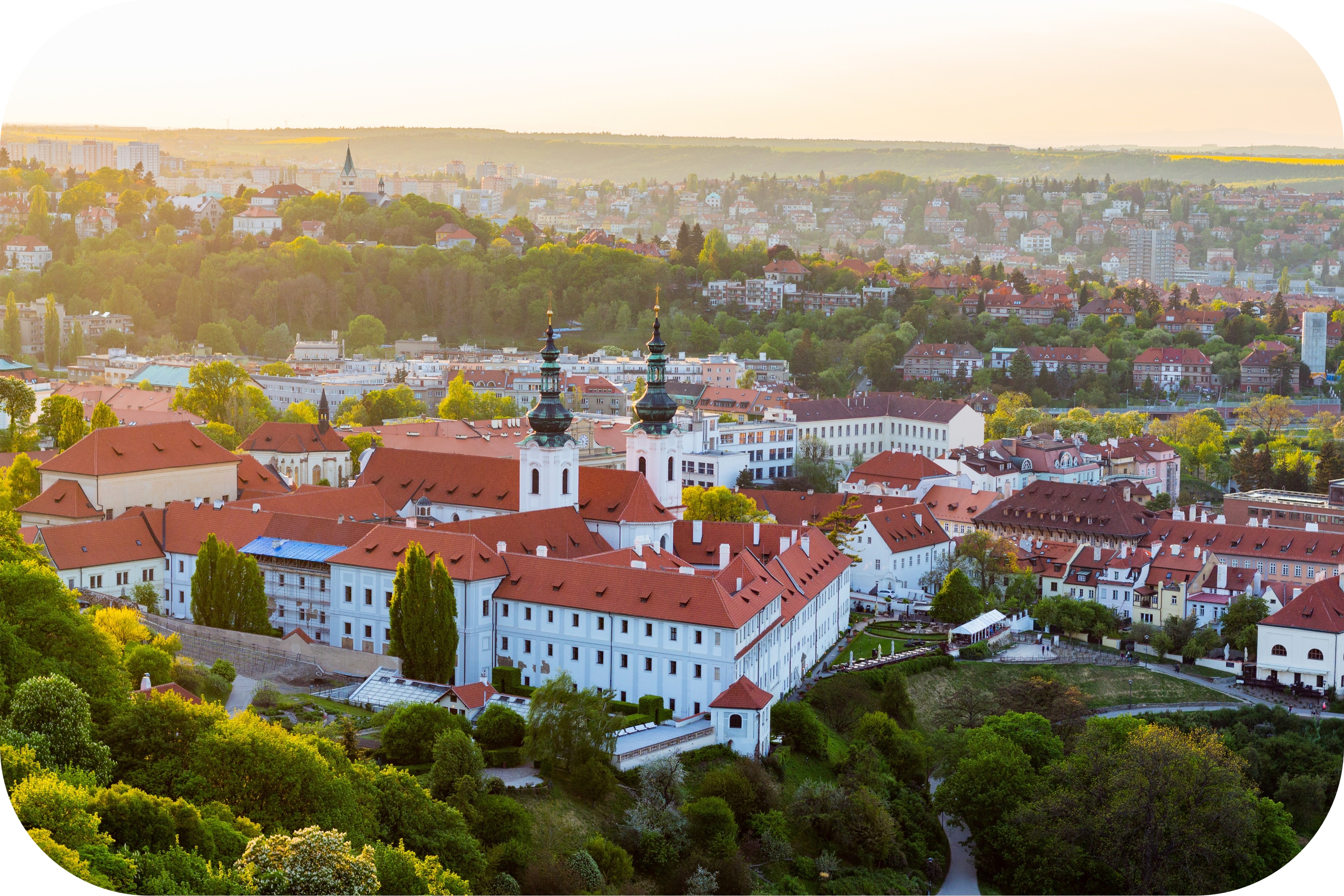 프라하를 한눈에 담을 수 있는 스트라호프 수도원에서 맥주 또는 커피를 제공합니다.
