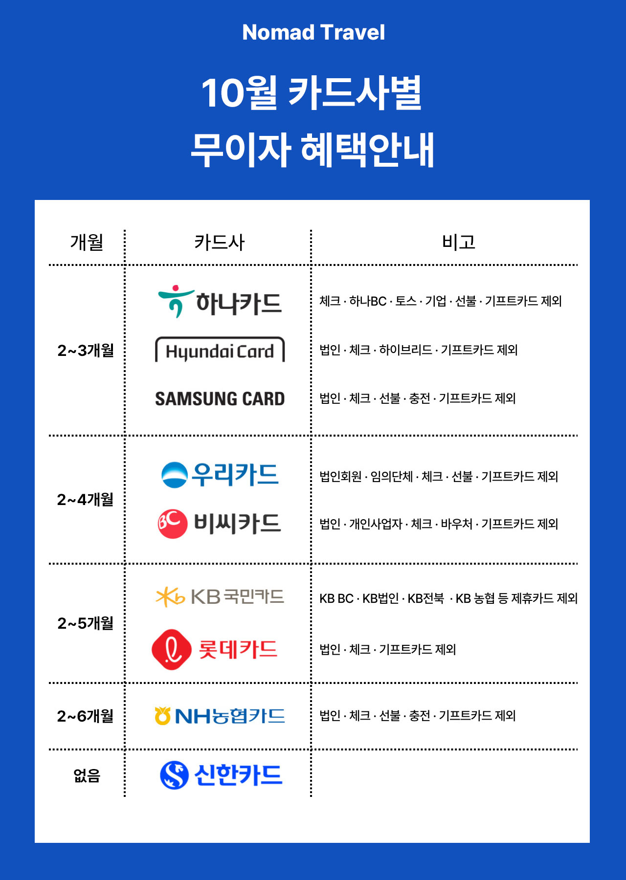 ※적용기간 : 10.1 - 10.31 안녕하세요. 노마드트래블입니다 :)2025년 10월 카드사별 무이자 혜택 안내드립니다. ※ 본 할부 무이자는 매달 적용 내용이 변경 됩니다. &n...