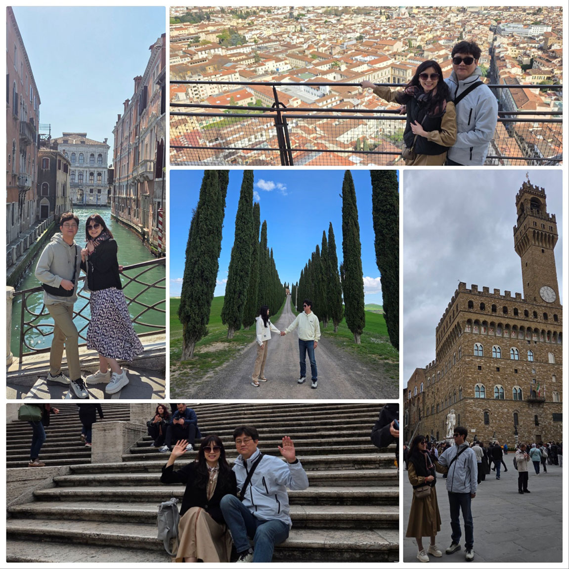 2026 3월 15일~23일, 7박 9일 이탈리아 여행 후기 결혼 20주년을 맞아, 30대 청년의 마음으로 이탈리아 여행을 계획했습니다. 코로나와 아이들 입시로 약 6년 동안 장거리 여행을 가지 못했던 터라 설렘과 함께 걱정도 있었어요. 그래서 지인의 추천으로 ‘노마드 여행’을 선택하게 되었습니다. 우선 노마드 여행을 한마디로 표현하자면, 노마드는 모르는 사람은 있어도, 한 번 경험한 사람은 다시 찾게 되는 여행사 라고 말하고 싶어요. 자유여행은 조금 부담스럽고 준비가 피곤할 것 같고, 그렇다고 단체 패키지는 너무 정신없게 느껴진다면, 저희처럼 이런 고민을 가진 분들께 정말 잘 맞는 여행이었습니다. 패키지 일정 자체는 크게 다르지 않기 때문에 따로 설명드리지 않아도 될 것 같아요 ? 대신 저희가 가장 감사하고 편하게 느꼈던 점들을 말씀드릴게요. 이탈리아 국내 이동은 비즈니스 기차를 이용했는데, 인원이 많지 않아 항상 출발 10분 전에만 도착해도 여유롭게 이동할 수 있었습니다. 기다림이 거의 없어서 여행 내내 훨씬 편안했어요. 그리고 여행에서 가장 중요한 ‘먹는 즐거움’! 점심은 이탈리아 현지식으로 4~5가지 코스가 제공되어 푸짐하고 다양하게 맛볼 수 있어 정말 만족스러웠습니다. 덕분에 저녁은 부담 없이 간단하게, 각자 취향에 맞게 골라 먹는 재미도 있었어요. 위에 사진이 베네치아에서 점심을 먹은 식사랍니다. ^^ 일정은 보통 오후 6시쯤 마무리되어 호텔로 돌아와 한 시간 정도 쉬고, 여유롭게 저녁을 즐길 수 있었습니다. 호텔 위치도 대부분 지하철역이나 기차역 바로 옆, 중심가에 있어 밤에도 비교적 안전하게 다닐 수 있었던 점이 좋았습니다. 무엇보다 기억에 남는 건 노련하고 센스있으신 안젤라 가이드님입니다. 사진을 정말 잘 찍어주셔서 50대를 향해 가는 저희 부부를 마치 30대처럼, 날씬하고 젊어 보이게 담아주셨어요 ? 덕분에 사진이 더욱 소중한 추억으로 남았습니다. 또 피렌체 일정 중 하루는 자유시간으로 구성되어 있었는데, 이 부분도 정말 만족스러웠습니다. 함께 여행한 네 커플이 각자의 취향대로 하루를 보내고, 저녁에 다시 만나 서로의 이야기를 나누는 시간도 또 하나의 즐거움이었어요. 노련하고 섬세하게 이끌어주신 안젤라 가이드님께도 진심으로 감사드립니다. 이번 여행은 저희 부부에게 정말 잘 맞는, 후회 없는 최고의 선택이었습니다. 그래서 내년 스페인 여행도 노마드로 계획하고 있습니다 ?