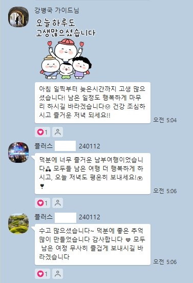 1월 12일 기차 남부 투어 고객님들께서 쿠쿠가이드님과의 투어가 너무 재미 있고 유익한 투어였다고 카카오톡 단체 채팅방에 후기를 말씀해주셨어요!