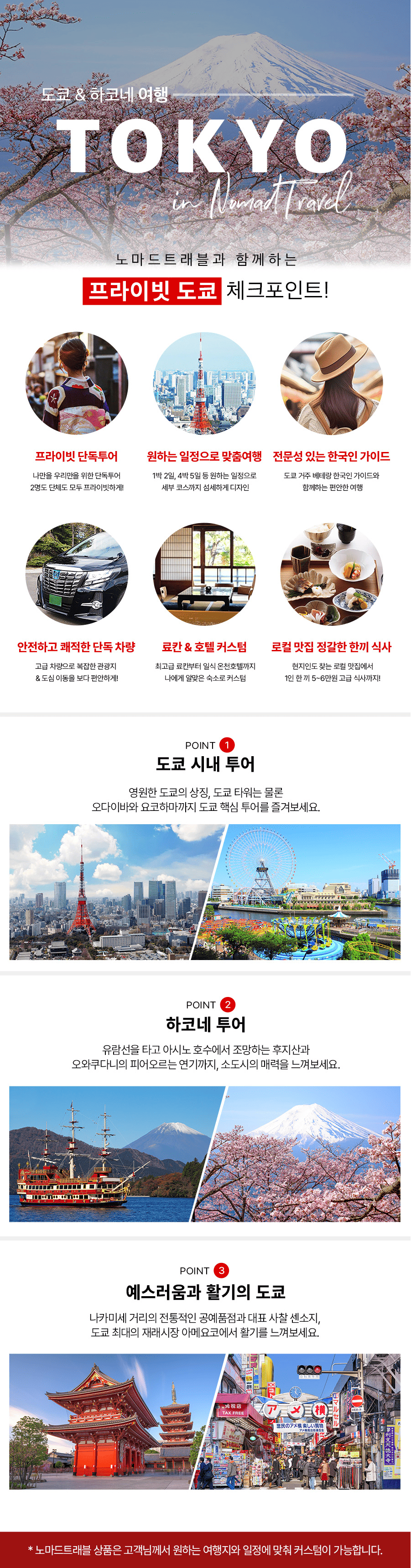 여행일정 DAY 1 1일차 도쿄 - 요코하마 [항공]항공편은 고객 요청에 따라 진행됩니다. [일본 도쿄]공항 도착 후 노마드 전용차량으로 오다이바 이동 (약 1시간 30분 소요)[도쿄 투어]오다이바 - 레인보우 브릿지 - 자유의 여신상 ✓ 노마드 전용차량으로 요코하마 이동 (약 1시간 소요) [요코하마 투어] 차이나타운 - 모토마치 - 아카렌가 소코 오다이바 도쿄 만에 위치한 인공 섬 오다이바는 해변공원과 함께 조성된 엔터테인먼트 타운입니다. 레인보우 브릿지 도쿄 만을 가로지르는 현수교로 낮에는 오다이바의 전망을 볼 수 있고, 밤에는 화려한 조명이 연출됩니다. 자유의 여신상 일본과 프랑스의 우호관계를 기념하여 만들어진 자유의 여신상 레플리카는 오다이바의 아이콘입니다. 차이나타운 세계 최대 규모의 차이나타운으로 먹거리 상점들이 줄지어 활기찬 분위기가 느껴집니다. 모토마치 1859년 개항 당시 항구 가까이에 위치한 곳으로 서양의 문물이 밀려 들어오며 형성된 거리입니다. 아카렌가 소코 일본 최초의 화물용 엘리베이터와 스프링쿨러, 방화도어 등 최신 설비를 갖춘 창고로 현재는 문화공간으로 각광받고 있습니다. [ 중식 ] 현지식 [ 석식 ] 현지식 [ 호텔 ] 요코하마 베이 호텔 도큐 또는 동급 DAY 2 2일차 도쿄 - 하코네 ✓ 호텔 조식 후 로비 미팅 ✓ 노마드 전용차량으로 하코네 이동 (약 2시간 소요) [하코네 투어] 아시호수 유람선 - 로프웨이 케이블카 - 오와쿠다니 유황계곡 ✳︎ 체크 포인트 !프라이빗 개인탕 객실의 최고급 료칸부터, 가성비와 가심비 모두 갖춘 일식 온천 호텔까지!고객님의 니즈에 맞추어 숙소 커스텀이 가능합니다. 아시호수 유람선 중세 유럽의 해적선 모양을 본떠 만든 관광 여객선을 타고 아시호수의 경치를 즐길 수 있습니다. 로프웨이 케이블카 - 오와쿠다니 유황계곡 유황 냄새와 대지에서 뿜어져 나오는 흰 연기가 압도적입니다. [ 조식 ] 호텔식 [ 중식 ] 현지식 [ 석식 ] 료칸 가이세키 석식 [ 료칸 ] 센고로 료칸 또는 동급 DAY 3 3일차 하코네 - 도쿄 ✓ 료칸 조식 후 로비 미팅✓ 노마드 전용차량으로 도쿄 이동 (약 2시간 30분 소요) [도쿄 투어]시바공원 - 도쿄 타워(외부관람) - 시부야 - 스크램블 교차로 - 시부야 스카이 전망대 (OR 아자부다이 힐스) 시바 공원 도쿄 타워를 한 눈에 담을 수 있는 도심 공원입니다. 도쿄 타워 영원한 도쿄의 심볼로 높이 333m의 전파탑입니다. 시부야 현대 일본 문화의 중심, 도쿄의 역동성을 상징하는 시부야입니다. 스크램블 교차로 수많은 인파의 동시 횡단이 이뤄지는 스크램블 교차로는 시부야의 현관이라 불립니다. 시부야 스카이 전망대 고층 루프탑에서 도쿄의 스카이라인을 감상할 수 있는 전망대입니다. [ 조식 ] 료칸 조식 [ 중식 ] 현지식 [ 석식 ] 현지식 [ 호텔 ] 임페리얼 호텔 도쿄 또는 동급 DAY 4 4일차 도쿄 ✓ 호텔 조식 후 로비 미팅 [도쿄 투어] 우에노 공원 - 아메요코 상점가 [아사쿠사 투어] 나카미세 거리 - 센소지 ✳︎ 여행의 마지막까지 노마드트래블이 세심하게 케어하겠습니다. 우에노 공원 일본 최초의 공원으로 도쿄 벚꽃 명소 중 첫번째로 손꼽히는 곳이 바로 우에노 공원입니다. 아메요코 상점가 도쿄 최대의 재래시장으로 정과 활기가 남아있는 상점가입니다. 나카미세 거리 센소지의 입구에서 본당에 이르기까지 펼쳐진 일본에서 가장 오래된 상점가입니다. 센소지 아사쿠사의 중심으로 관세음보살을 모시는 도쿄에서 가장 큰 사찰입니다. [ 조식 ] 호텔식 [ 중식 ] 현지식